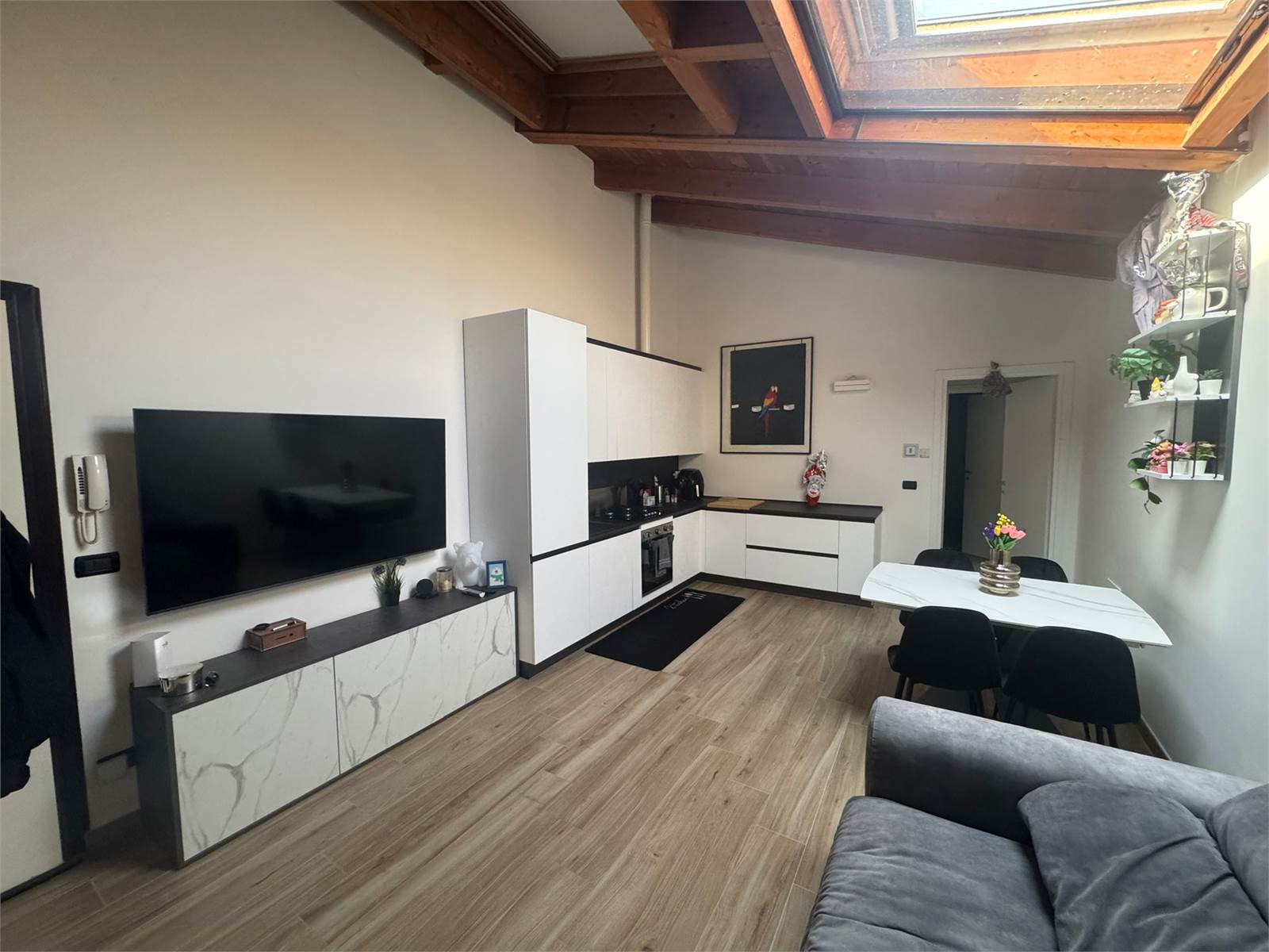 L'attico è arredato a nuovo e pronto per essere abitato. La presenza di armadi a muro ottimizza gli spazi, mentre il riscaldamento a pompa di calore garantisce comfort in ogni stagione. Inoltre, l'aria condizionata assicura un ambiente fresco durante i mesi estivi. Il garage di 18 mq è incluso nel prezzo, e la zona offre un'alta disponibilità di parcheggi nelle vicinanze.